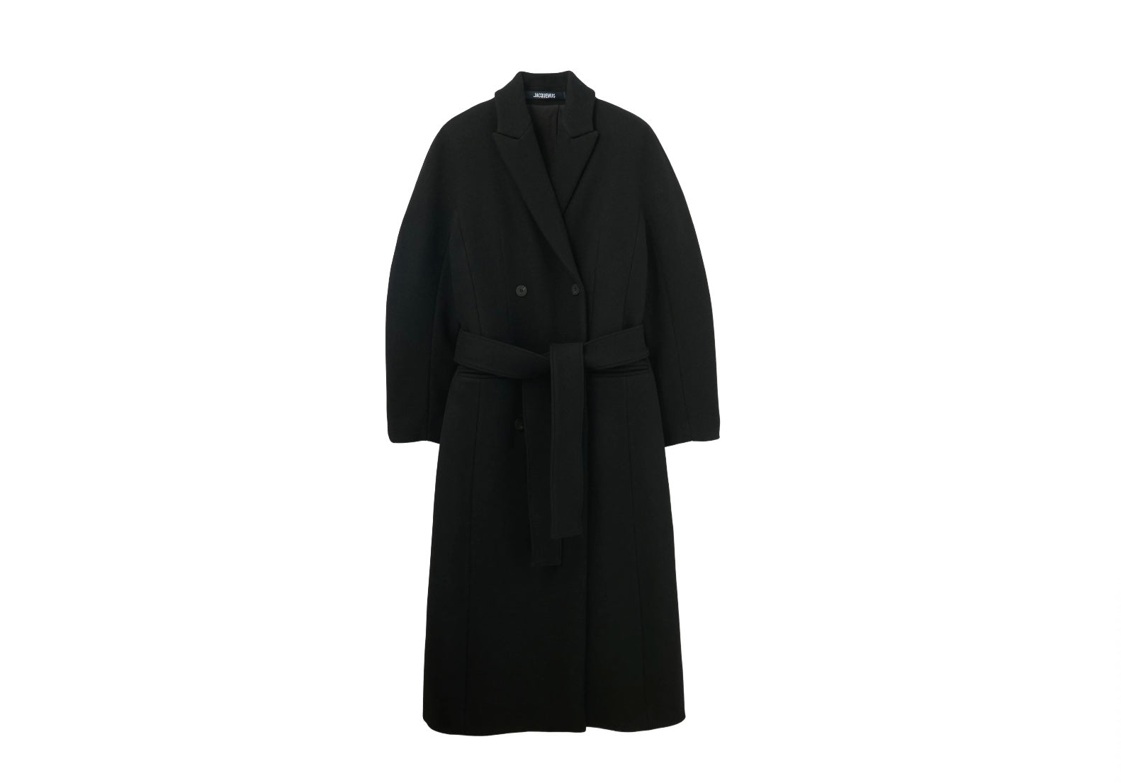 Crafted from 100% virgin wool in black, featuring peak lapels, a belted waist, long sleeves, and a long-length silhouette with classic double-button fastening.