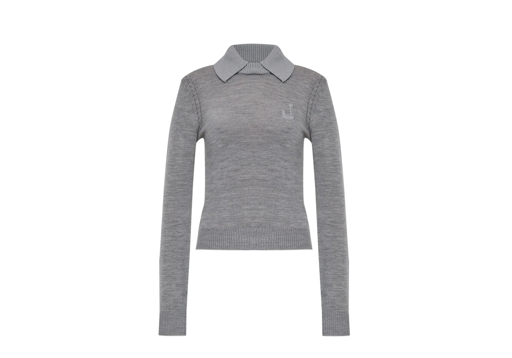 An ash grey knitted jumper with a subtle logo embroidery and clean polo collar. Effortless and refined.