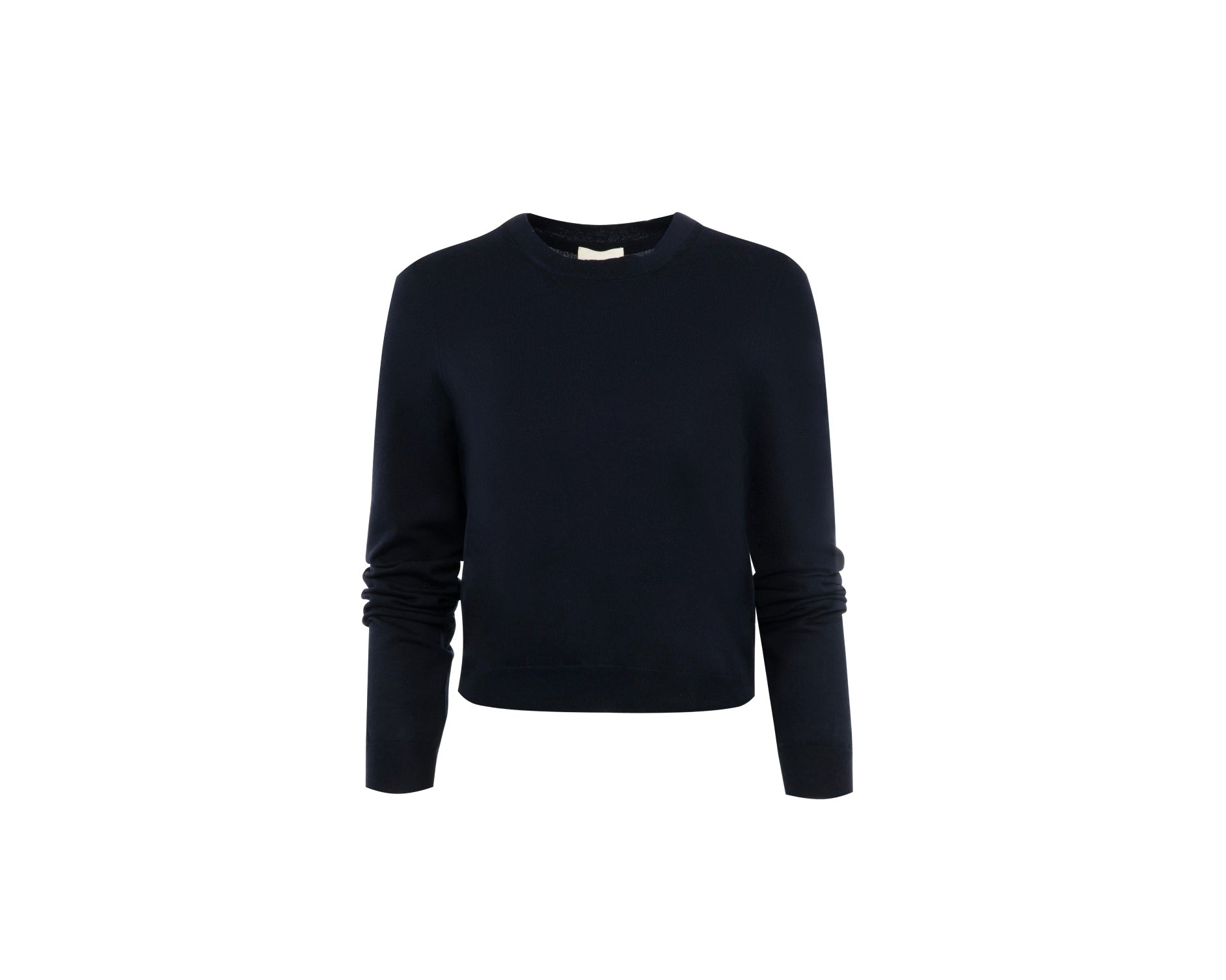 Designed in navy with a classic crew neckline, long sleeves, ribbed cuffs, and a cropped hem finished with a subtle textured knit.
